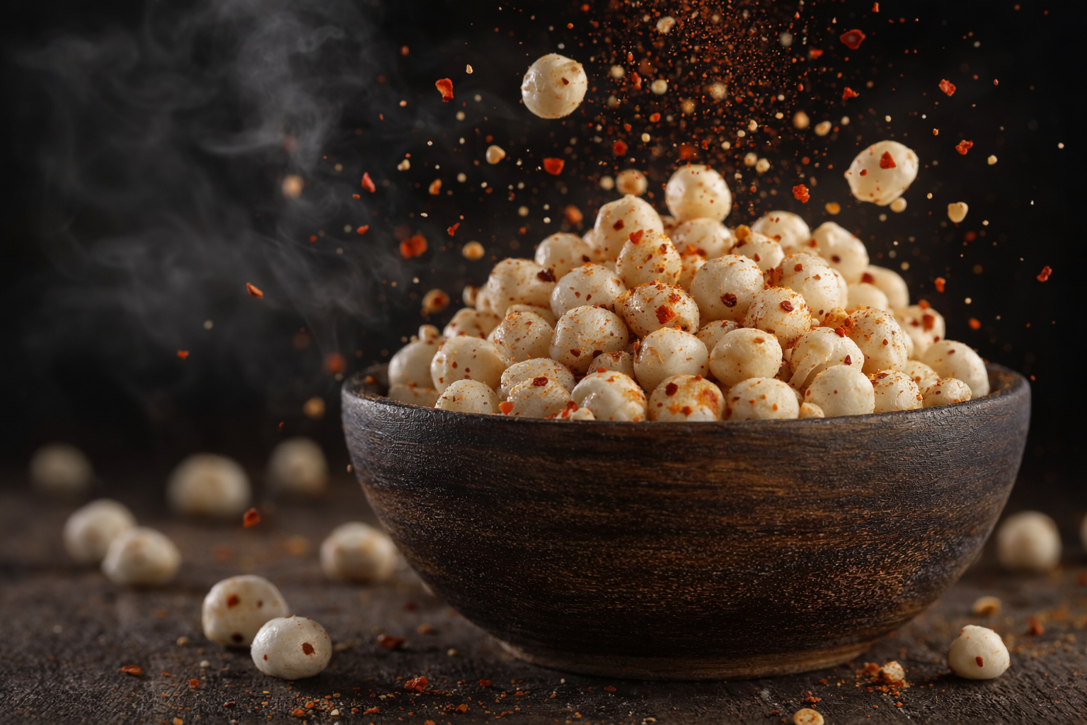 Raw popped fox nuts/lotus seeds, Bihar origin, graded by suia size, plus roasted and flavored makhana in 20 signature flavors.